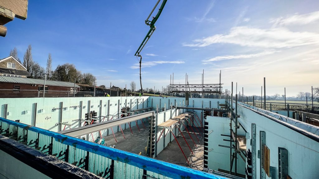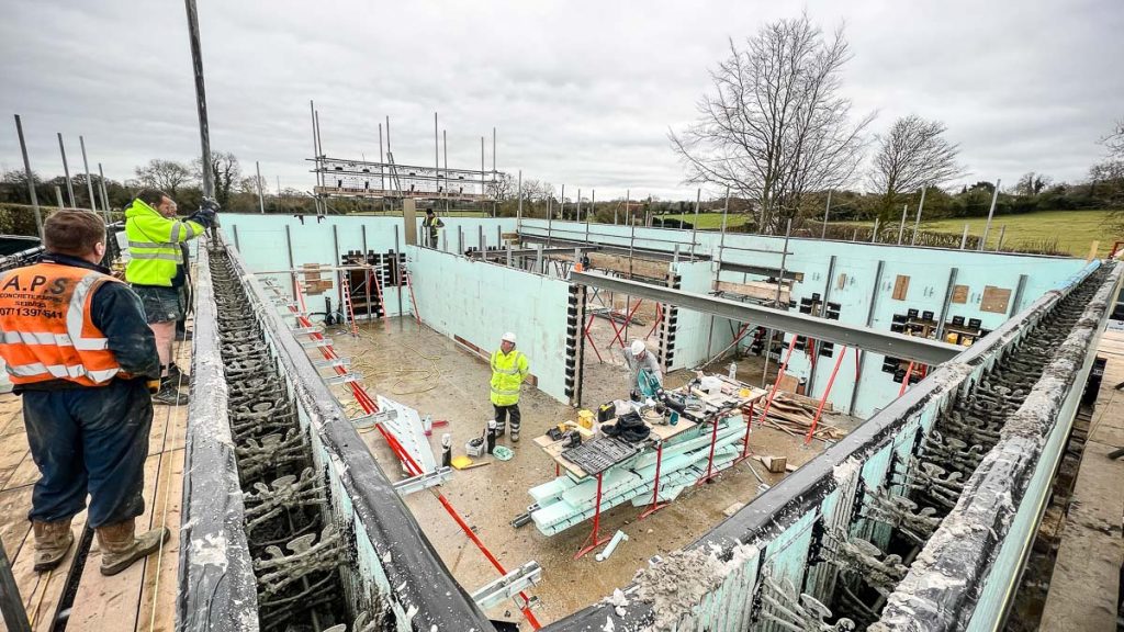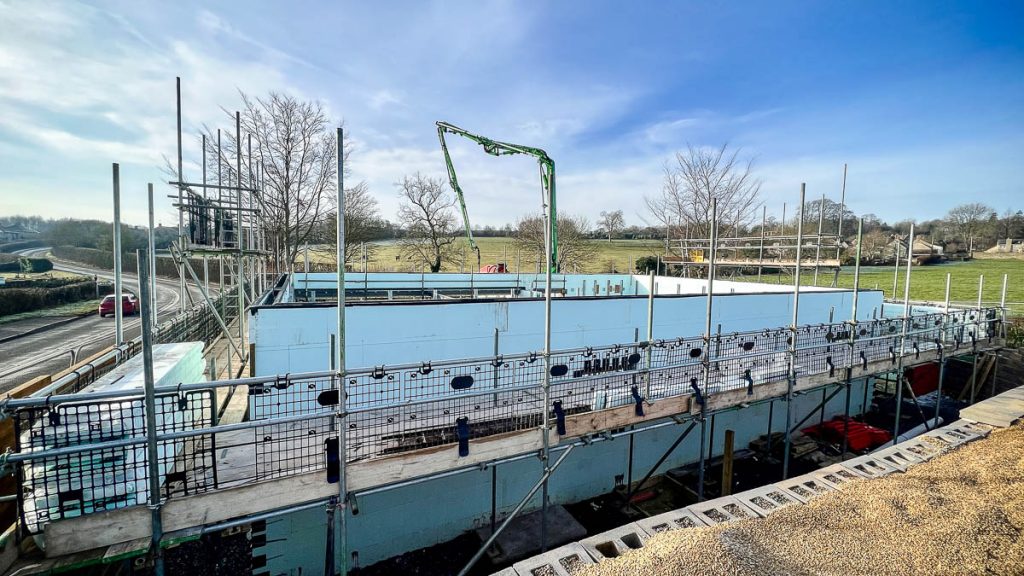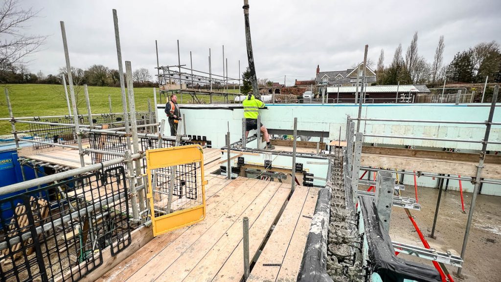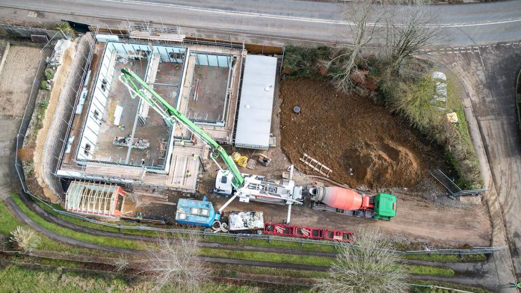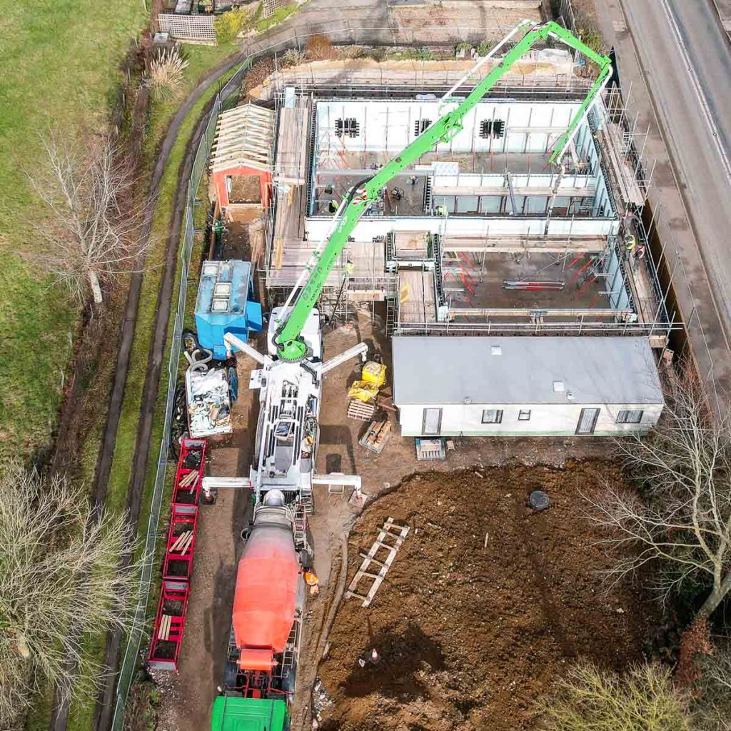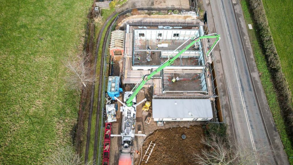 Friday 10th Feb 2023 – The big pour day… 4 loads later and all of the ground floor walls are now full of concrete. Here’s some photos from the day from the air and on the ground.