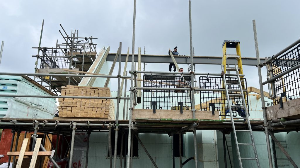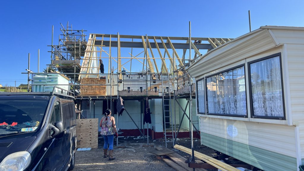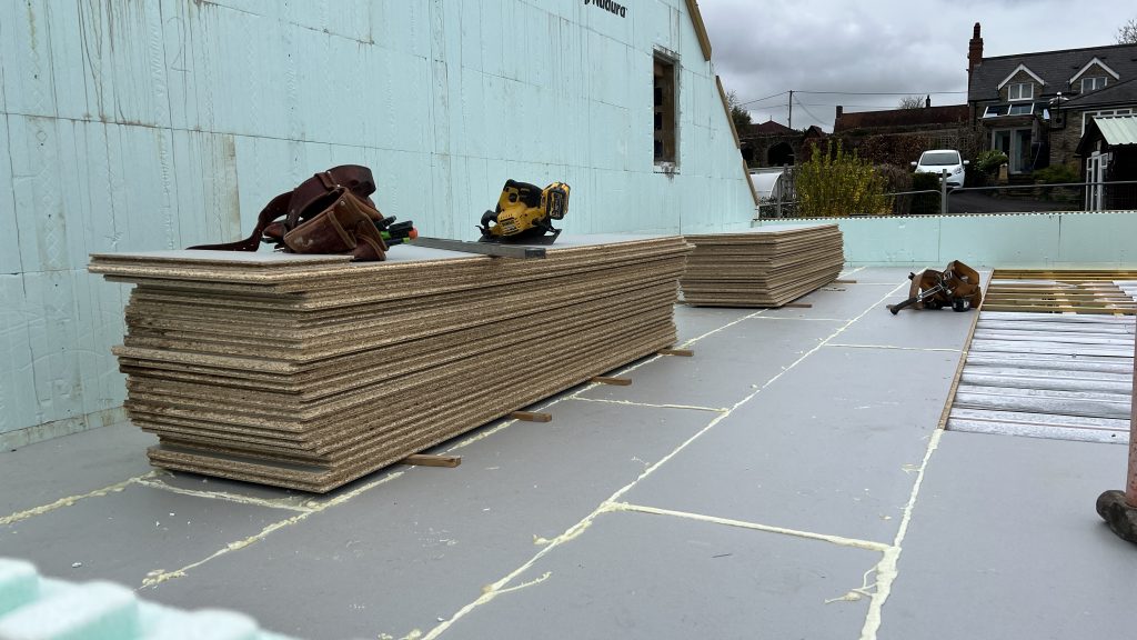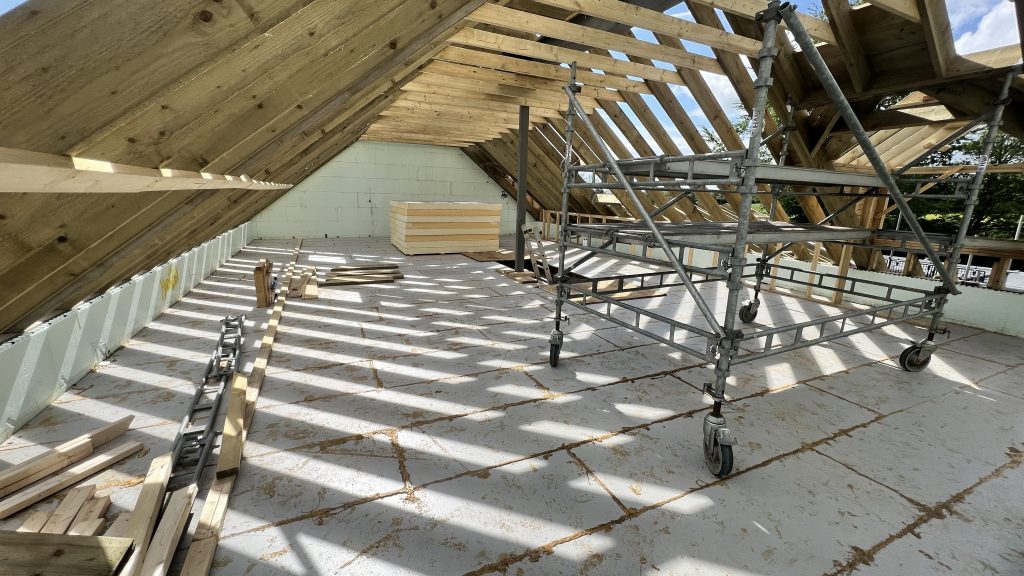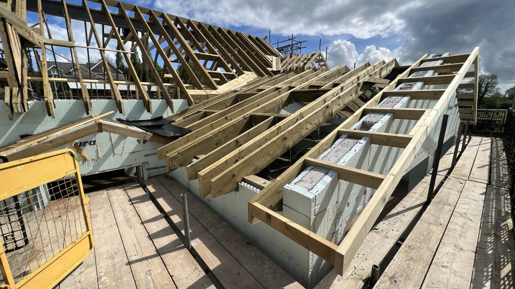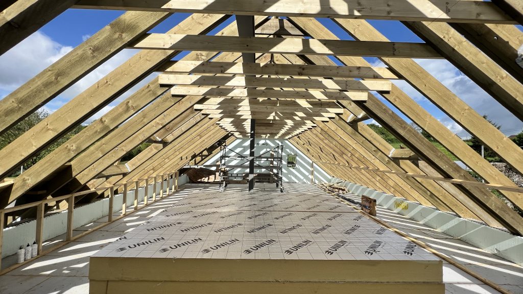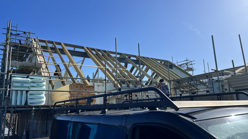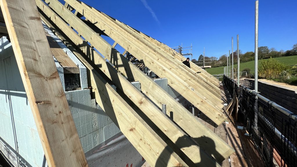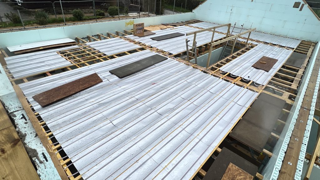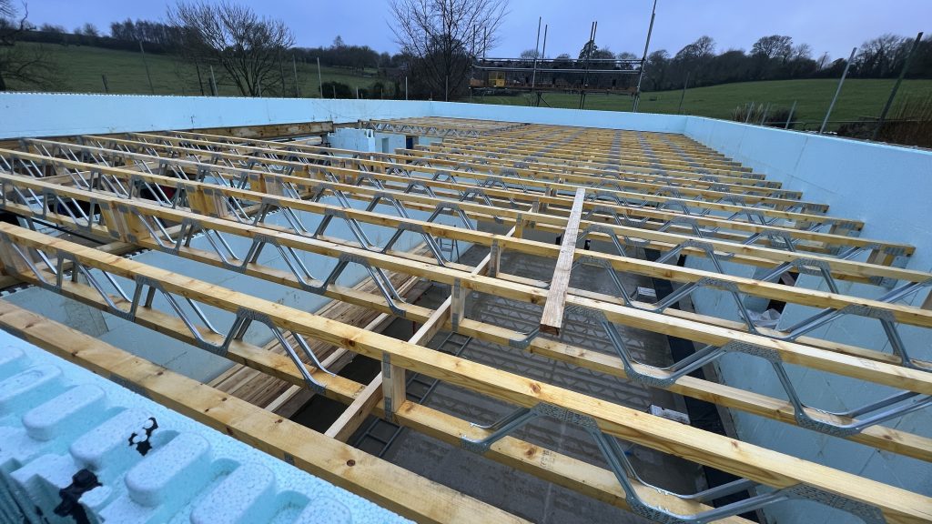 The floor joists are all now fitted. Here’s a couple of videos showing the joists in place and Mark talking through the room layouts for the two floors.